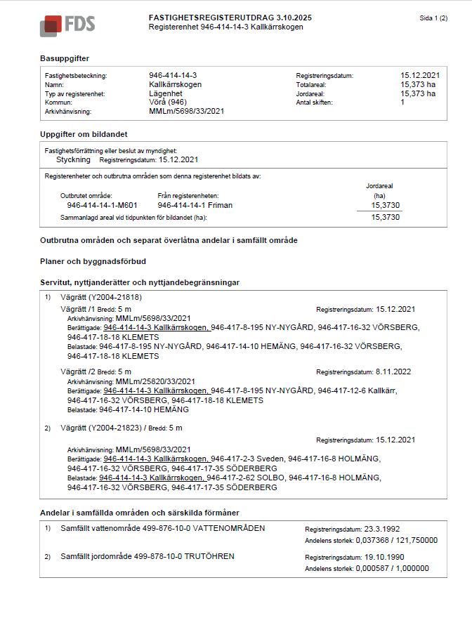 Fastigheten Kallkärrskogen 946-414-14-3 består till största delen av gallringsskog med dominans av tall, med god tillväxtpotential. Området har god tillgänglighet – intill skiftet går traktorväg och motionsspår.