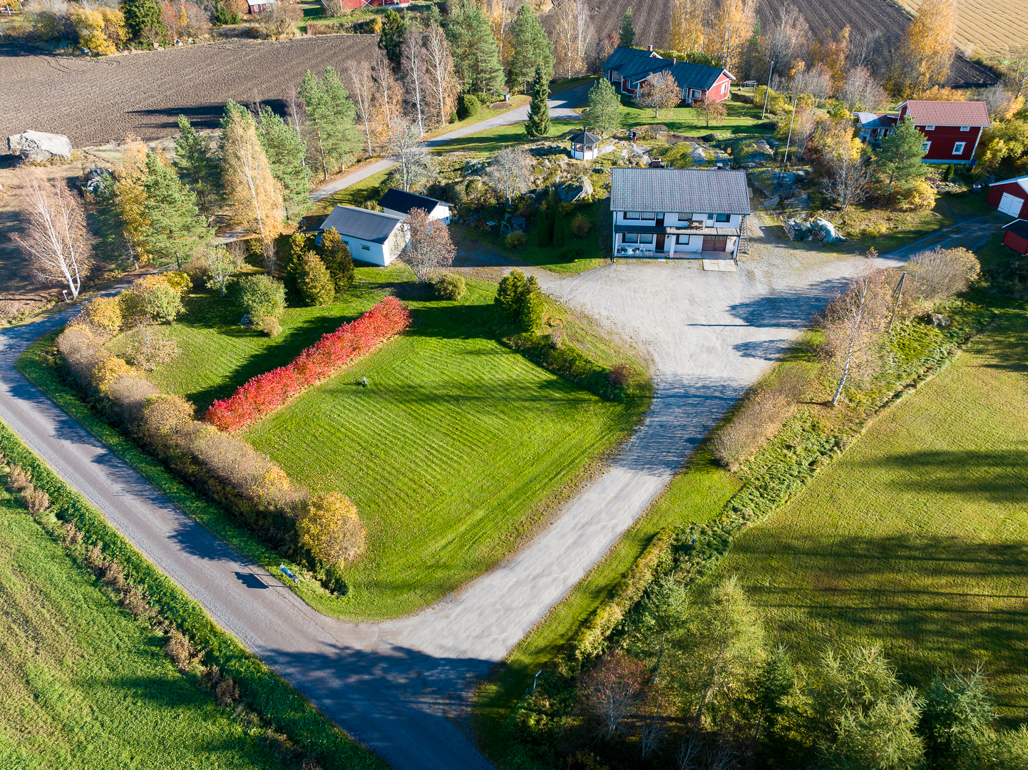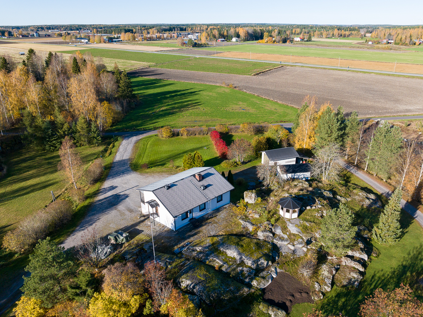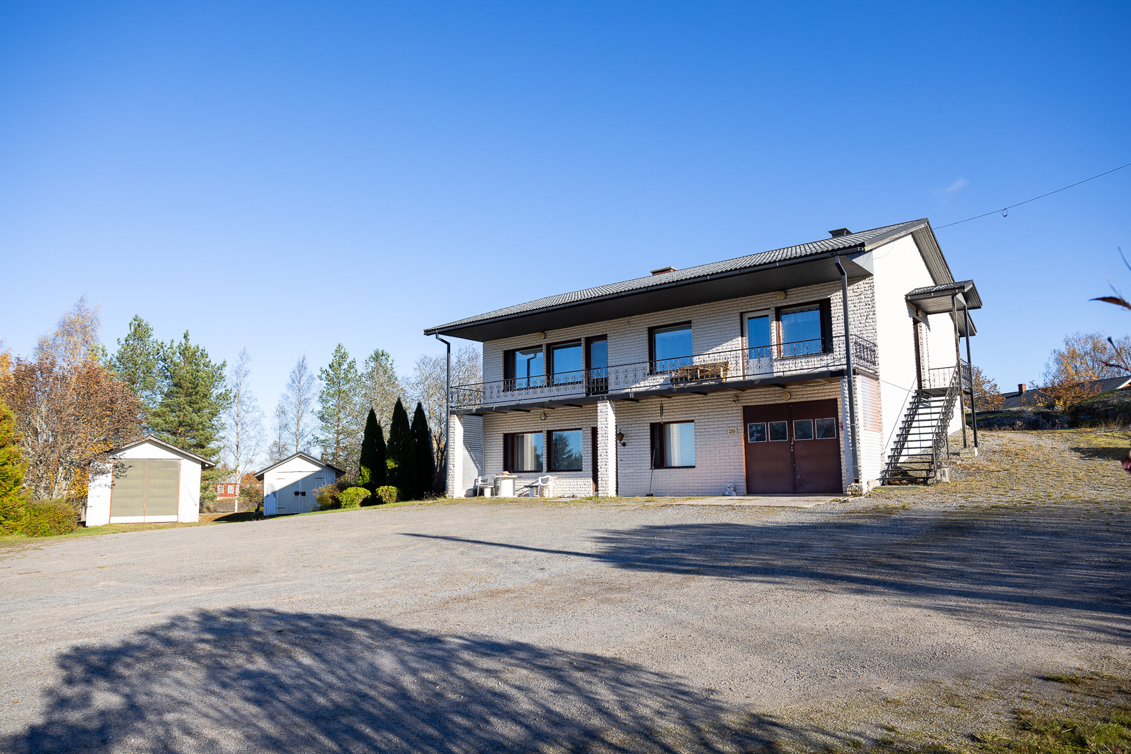Fastigheten ligger på en 5 200 m² stor tomt med bra gårdsplan och två ekonomibyggnader.