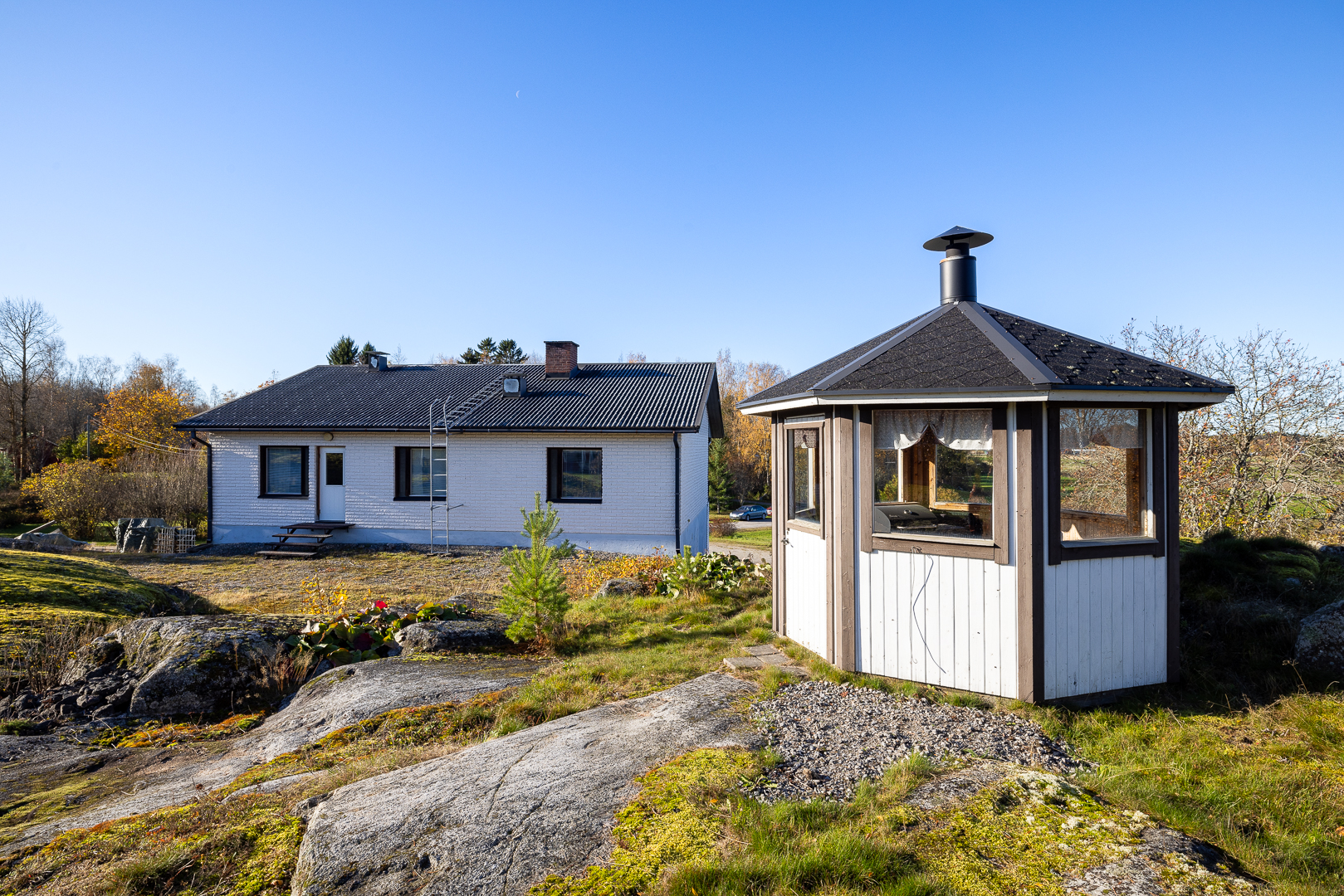 Dessutom finns en grillkåta i anslutning till den bergiga trädgårdsdelen – en trivsam plats för samvaro året runt.