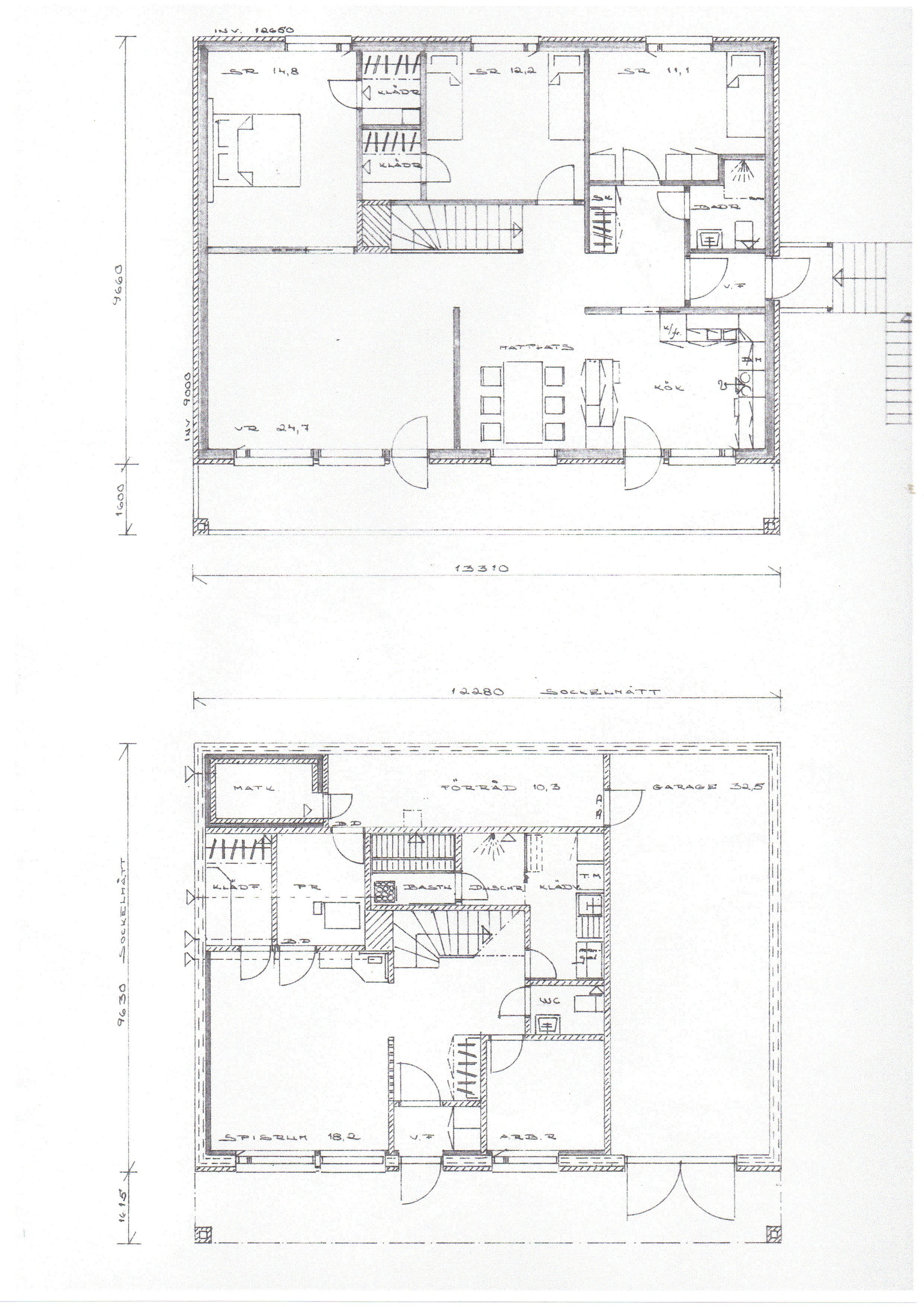 I källarplanet finns inbyggt garage, bastuavdelning med dusch och wc, förråd och matkällare samt spisrum och arbetsrum.
