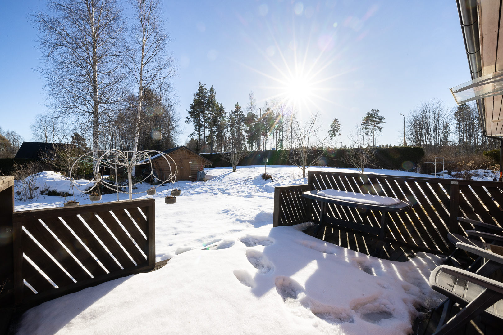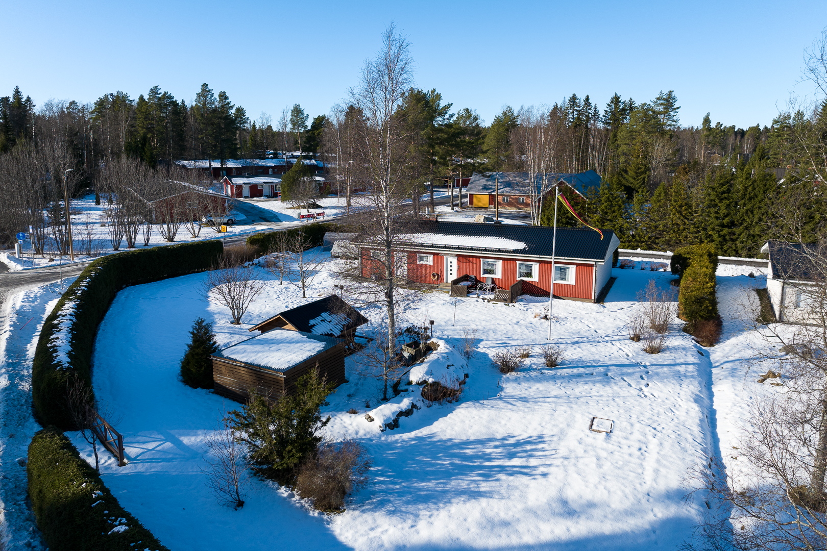 Tomten är 1 737 m² och består av välskött gräsmatta, gårdsplan och planteringar. En tät granhäck ger bra insynsskydd och skapar en privat känsla mot vägen. På gården finns även en lada som ger extra förvaringsutrymme.